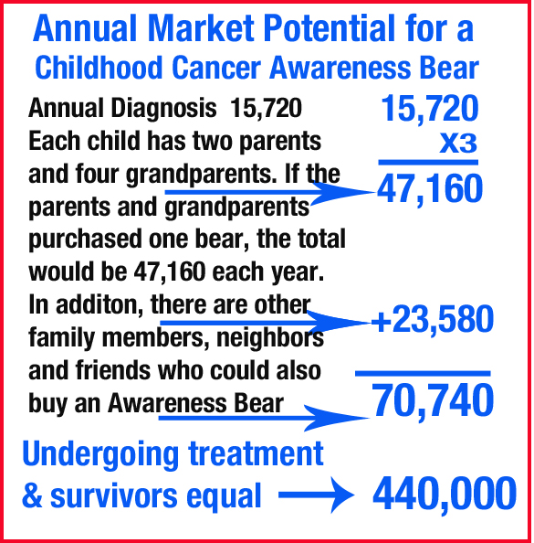 If they made an awareness bear, companies that profit from the sale of stuffed animals could do themselves a big favor and also help children with cancer at the same time. I believe they don’t realize the profit potential in having a childhood cancer bear. Potential manufacturers may only be looking at the annual diagnosis rate. They may not even be aware that there are over 40,000 children undergoing treatment now and there are 500,000 survivors in the United States alone! Can you imagine how many bears could have been sold if they were available at the time of diagnosis? If they offered bears in blue, pink, yellow and brown, each with a beautiful gold ribbon, think of how many they could potentially sell? A lot of kids would want to own all of them. The possibilities are endless!