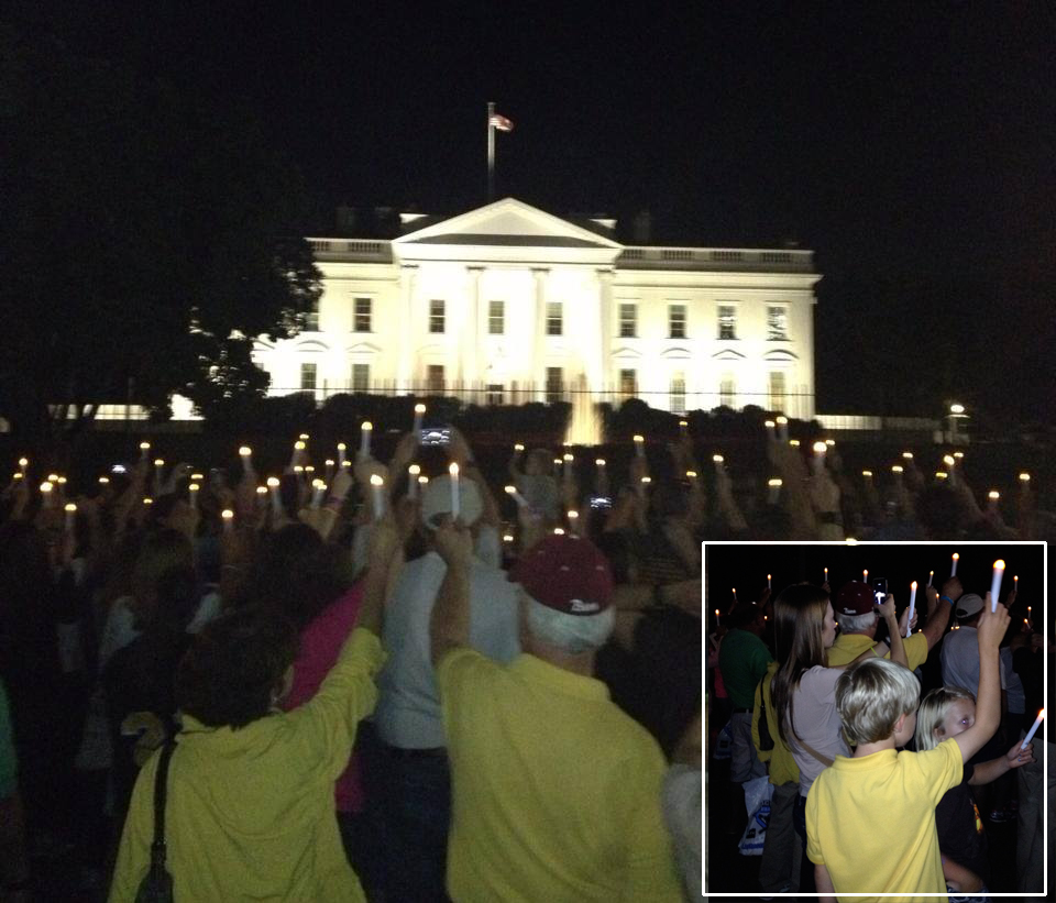 ConorWhiteHouse_edited-1It all came together on Saturday night for Conor at the very first Golden Lights candlelight vigil in Lafayette Park, just across the street from the White House. It was held to honor the children who died because of cancer. First, our little man and other survivors were recognized. Afterwards, I watched Conor listen intently to each parent who spoke about the child they lost. There was complete silence in the huge crowd of about 1,000 as one by one gave very compassionate testimony what their child and their family went through in their own battle against cancer only to lose their child in the end. It was chilling. From there, we all moved silently to the gates of the White House where all of us in unison raised golden flame candles and sang Amazing Grace. It was the most moving and chilling event I have ever seen.