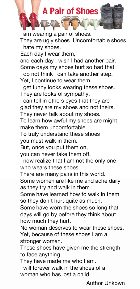One day in September, after my wife Ellie and I visited a Senator in the Hart building, we met up with Ellyn Miller (Gabriella Miller’s mother) on a beautiful blue-sky morning in front of the Cannon House Building in Washington, DC. Ellyn had walked there from Union Station. We were there to lobby for medical research funds. Our grandson Conor is a survivor of neuroblastoma and Ellyn’s daughter was taken by DIPG brain cancer. We had a lot of visiting to do on the Hill. During the day, we walked from the Cannon to the Rayburn, back to the Cannon, then to the Rayburn again and on to the Russell and back to the Cannon, not to mention all the walking inside those huge buildings that house our Congressional offices. For each word we uttered on behalf of medical research for childhood cancer, we must have spent a hundred steps walking from one place to another. By that afternoon, we all talked about our shoes and how much they hurt our feet. About a month later, I found this piece and then I realized how much Ellyn’s shoes must hurt her every day. This is dedicated to her and to other mothers who have had a child taken by cancer.