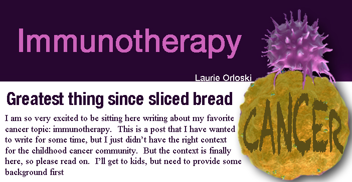 So right now, everybody in the cancer world is talking about immunotherapy as the greatest thing since sliced bread. I tend to agree. We have a long road ahead though. The experience with CAR T-cell therapy has been so positive so far, but responses like that will not be achieved for every patient in every trial. Long-term efficacy and safety data are critical, but that takes time. Nonetheless–immunotherapy is BACK and seemingly here to stay, and I am personally so excited to see what’s next. I follow this area of immunotherapy very closely, not just for children but for adults, and I will be sure to keep you posted too!